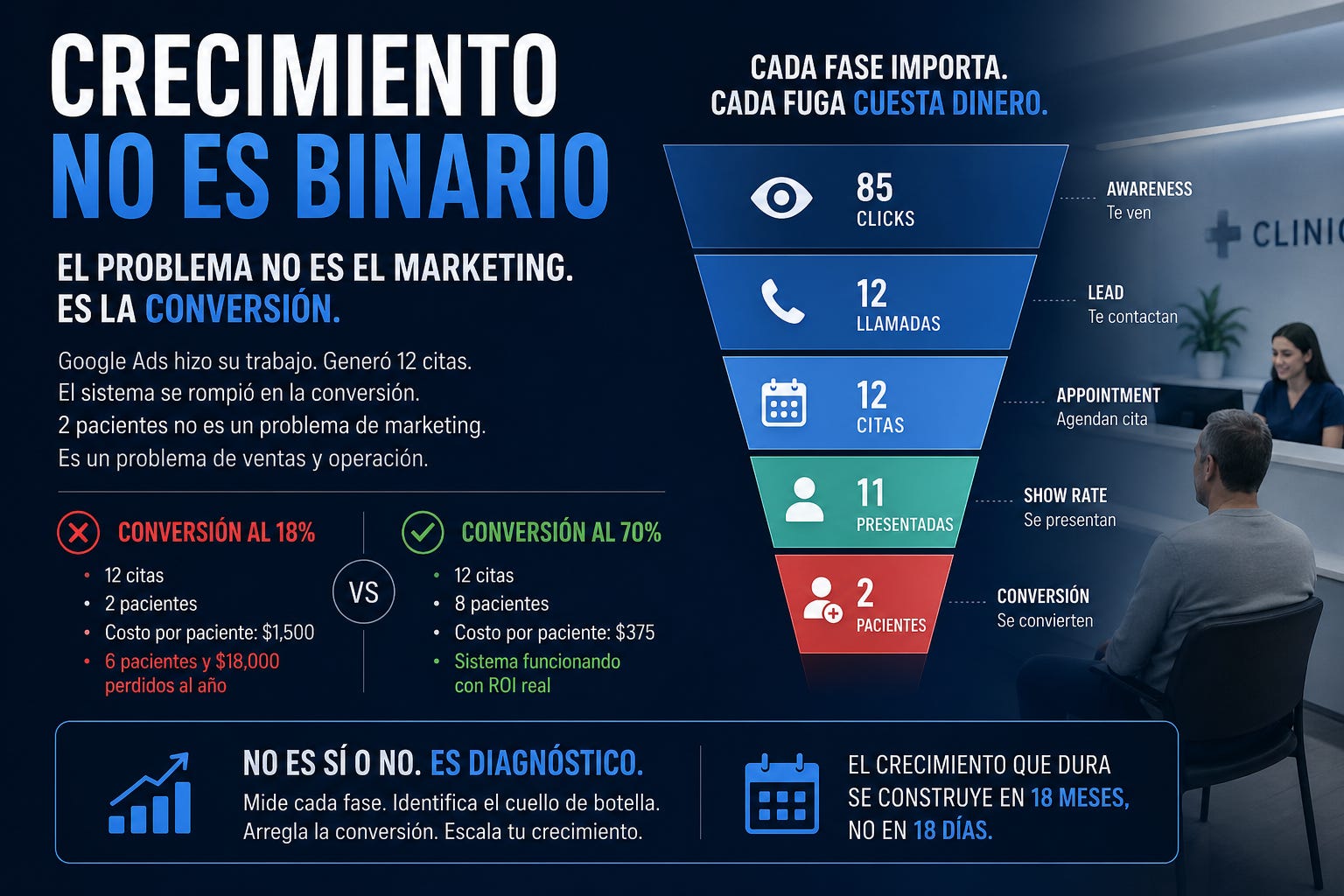 Le dije: “Entonces aquí está lo que veo. Google Ads hizo su trabajo. Generó 12 citas. Eso es marketing funcionando. Pero de esas 12, solo 2 se convirtieron en pacientes. El problema no está en la publicidad. Está en la conversión.”